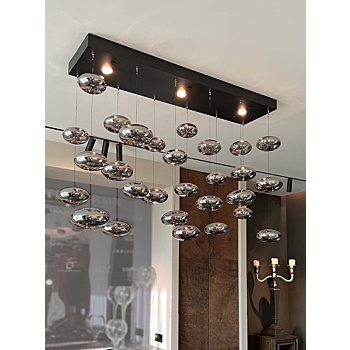Achter in de ruimte vind je een luxe keuken, compleet met de elegante Dream hanglamp. Deze unieke hanglamp, met met de hand geregen glazen bollen, voegt een vleugje verfijning toe aan de ruimte. De lamp wordt op prachtige wijze uitgelicht door subtiele spots, perfect geïntegreerd in het plafond.