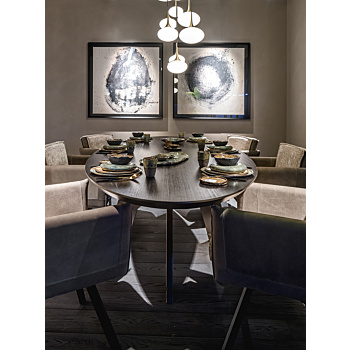 Centraal in de boardroom bevindt zich een grote houten vergadertafel, verlicht door de handgemaakte Vernazza hanglamp, een van Maretti’s nieuwste meesterwerken. Deze lamp, vervaardigd in de eigen werkplaats van Maretti in Almere, straalt exclusiviteit en vakmanschap uit.